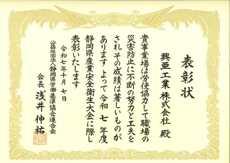 当社はこのたび、静岡県労働基準協会連合会より「安全の部」において優良事業場として表彰されました。